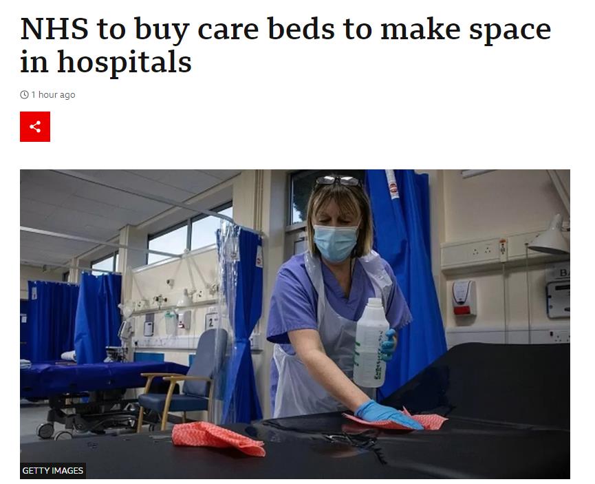 - 媒体报道,为了缓解医院前所未有的压力,英国数千名NHS患者将被转移到养老院…