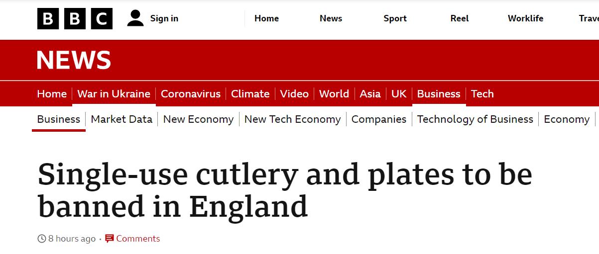 - 英格兰将禁止使用塑料餐具、塑料盘子和托盘等一次性用品,预计政府将于1月14日公布相关细节…
