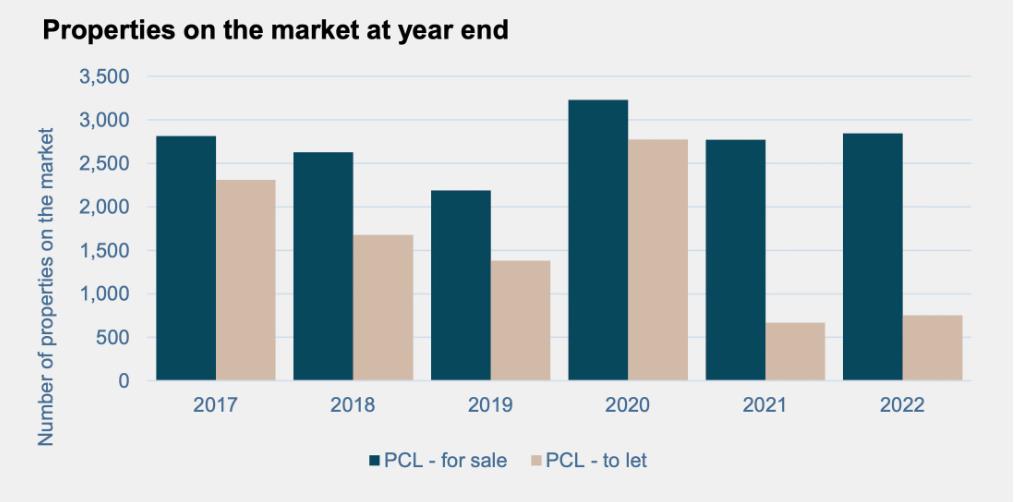 截至2022年第四季度末,PCL市场有2,847套房屋上市,比第三季度末下降了9%,但仍比去年同期高出3%。