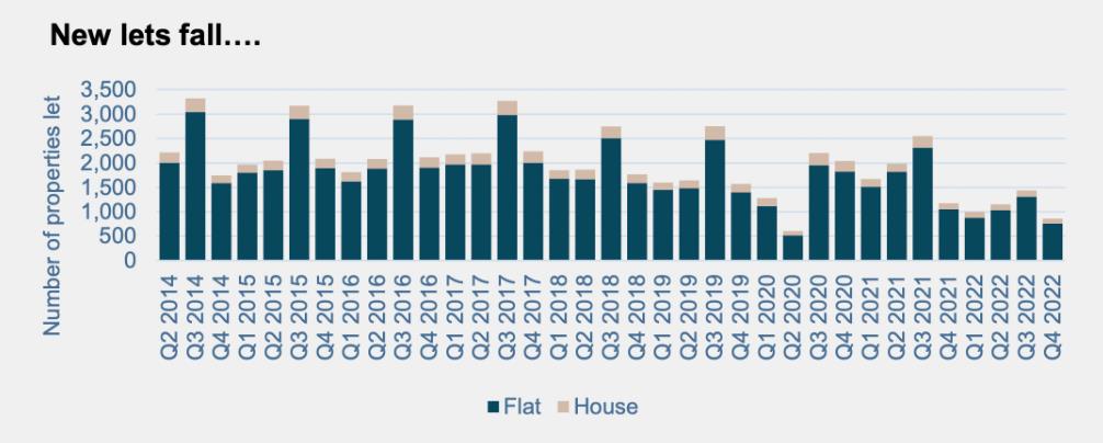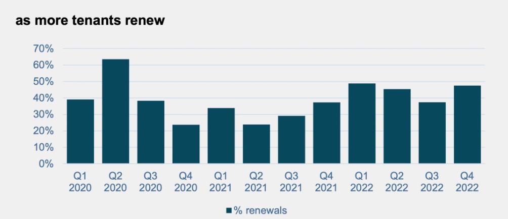 2022年第四季度末可供出租的房产数量比2019年低45%。