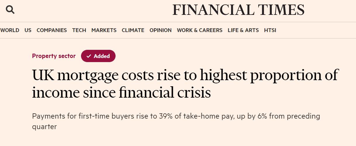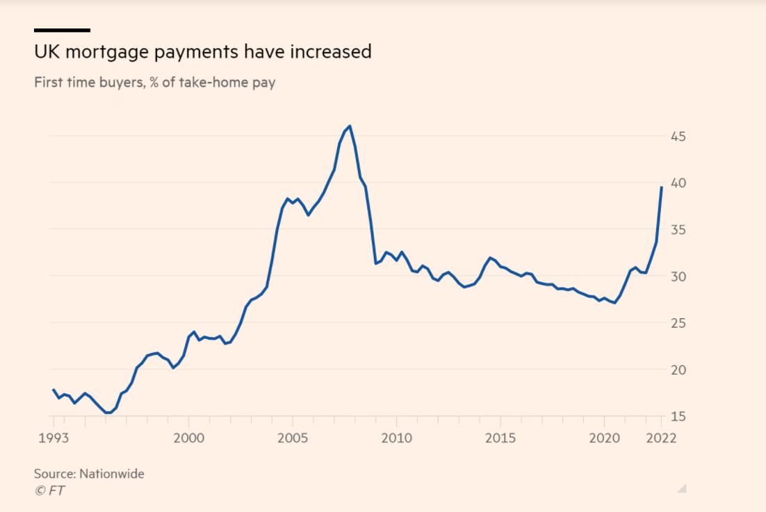 数据显示,在2022年最后一个季度,首次购房者的抵押贷款还款额占实得工资的39%,高于前三个月的33%,也是自2008年以来的最高水平。