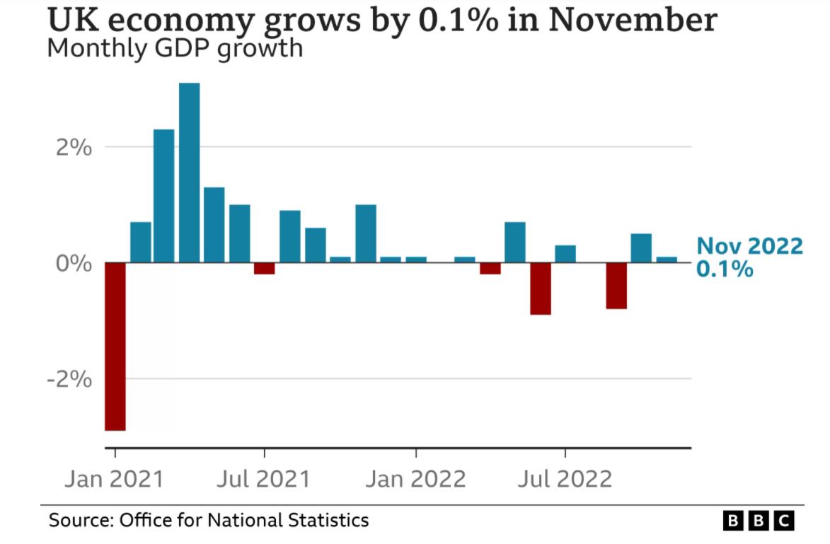 据统计,英国GDP(衡量服务、建筑和制造业产出的重要经济指标)在去年11月增长了0.1%。
