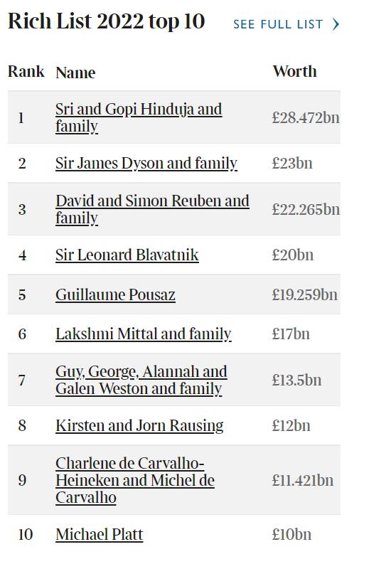 去年,位居英国亿万富翁排行榜第一的是英籍印裔企业家Hinduja家族,该家族的净资产超过了280亿英镑。