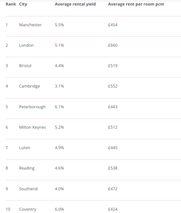伦敦,从去年的第六位上升到今年的第二位,平均每个房间的租金为660英镑,是全英国最高的,回报率为5.1%。