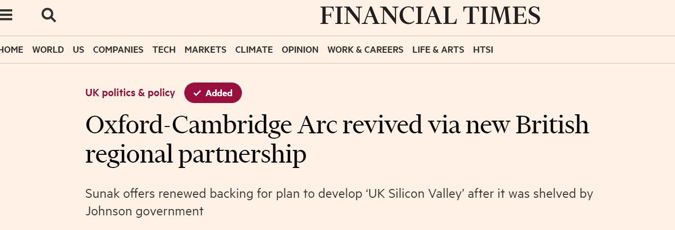 最初的牛津-剑桥科技弧由英国国家基础设施委员会于2017年起草,但后来因为一系列原因被搁置。但如今,苏纳克的决定被视为政府正在重新参与这一概念的积极信号。