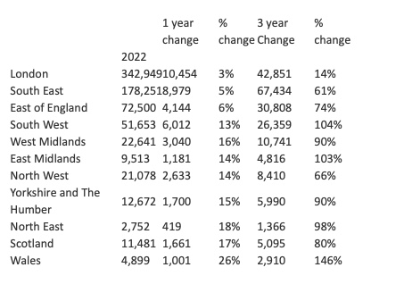 更高的价格增长和对大型房产需求的增加,导致41,223套房产在2022年超过100万英镑的门槛。这使得英国100万英镑的住宅市场总价值现在达到1.43万亿英镑。