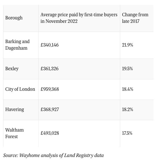 2022年底,在巴金和达格南地区,说套房的平均费用比2017年底高出21.9%。在贝斯利(Bexley),同期涨幅为19.5%,在哈弗林(Havering)为18.2%。在整个伦敦,首次购房者买的房产通常需要比5年前涨了近5万英镑。