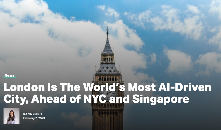 该机构分析了AI风险投资额、职业和教育机会登指标后,伦敦拔得头筹,成为世界上最受人工智能驱动发展的城市。