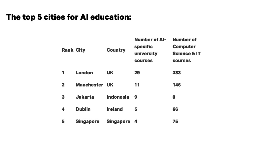 在教育方面,英国大学开设了29门AI相关课程,以及300多门计算机科学和IT课程。