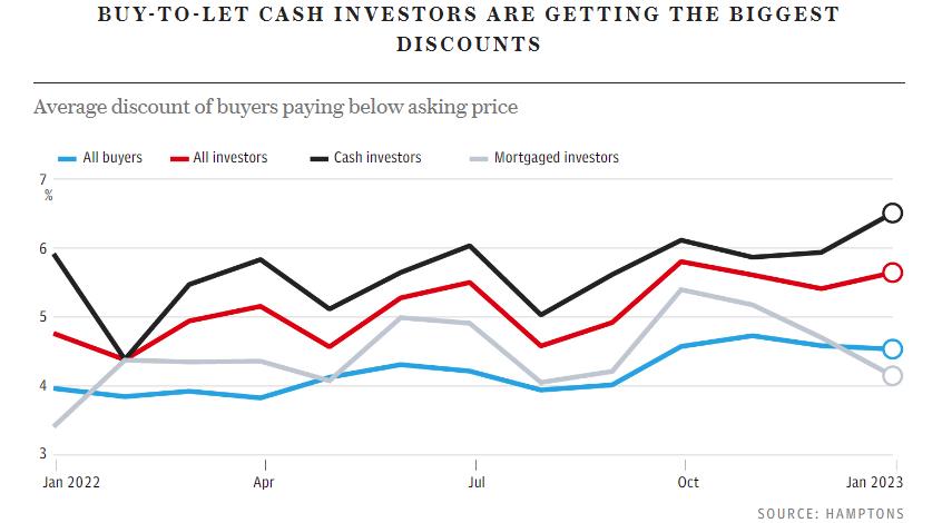 根据Hamptons的数据,对于有能力以现金形式购买的投资者,折扣可能更高。通过现金进行购房出租的买家上个月平均获得6.5%的折扣,而抵押贷款买家的折扣为4.5%。