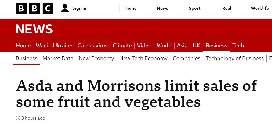 - 由于新鲜农产品供应短缺,英国两大连超Asda和Morrisons开始限制一些水果和蔬菜的销售,预计短缺还将持续“几周”…