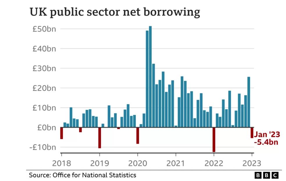 根据英国国家统计局 (ONS)的数据,尽管英国政府支出大量资金以帮助民众支付能源账单,并向欧盟支付了拖欠的历史关税,但英国政府在1月份出现意外的财政盈余。