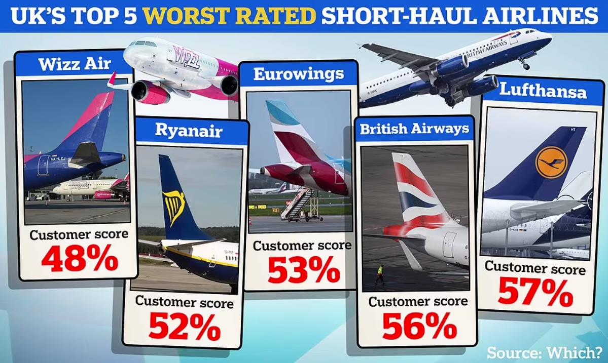 Wizz Air在英国八个机场运营短途航班,包括伯明翰、爱丁堡、盖特威克和卢顿。该航空公司的“整体客户满意度”得分为48%。