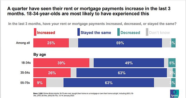 在过去三个月中,四分之一的英国成年人的抵押贷款或租金成本增加,其中 18-34 岁的人最有可能受到影响。