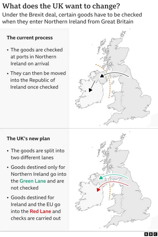 新的协议希望将货物分为2批,一批是仅进入北爱尔兰的,无需边检和海关管制。另一批是针对运往爱尔兰和欧盟的货物,需要接受边检和海关管制。