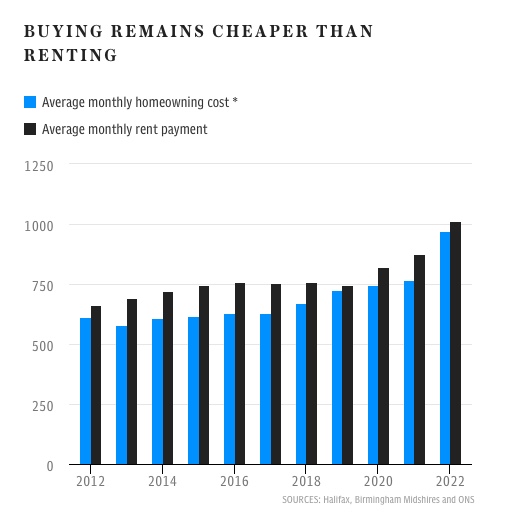 目前,首次购房者平均每月还贷款的金额约为971 英镑,而租房者在类似的出租房上花费约 1,013 英镑。如此看来,买房比租房每个月的成本每月还要便宜42英镑。
