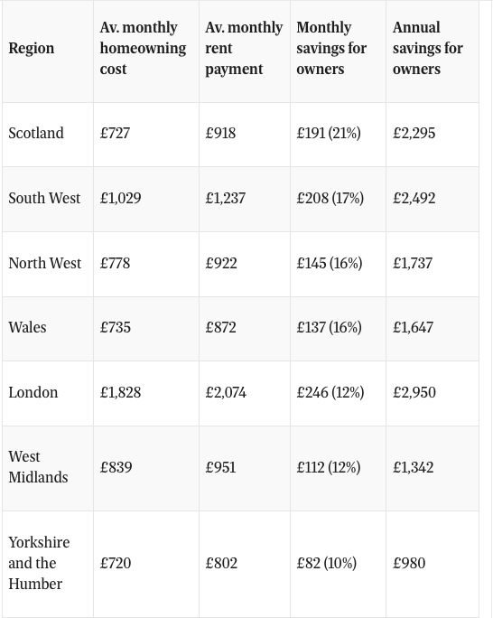在整个英国,买房和租房支出差距最大的地方是苏格兰,房主可以比租房者节省21%。其次是英格兰西南(17%),英格兰西北(16%),威尔士(16%),伦敦(12%)……