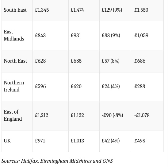 如下图所示:在英国不同地区,月供比一年之前上涨了多少