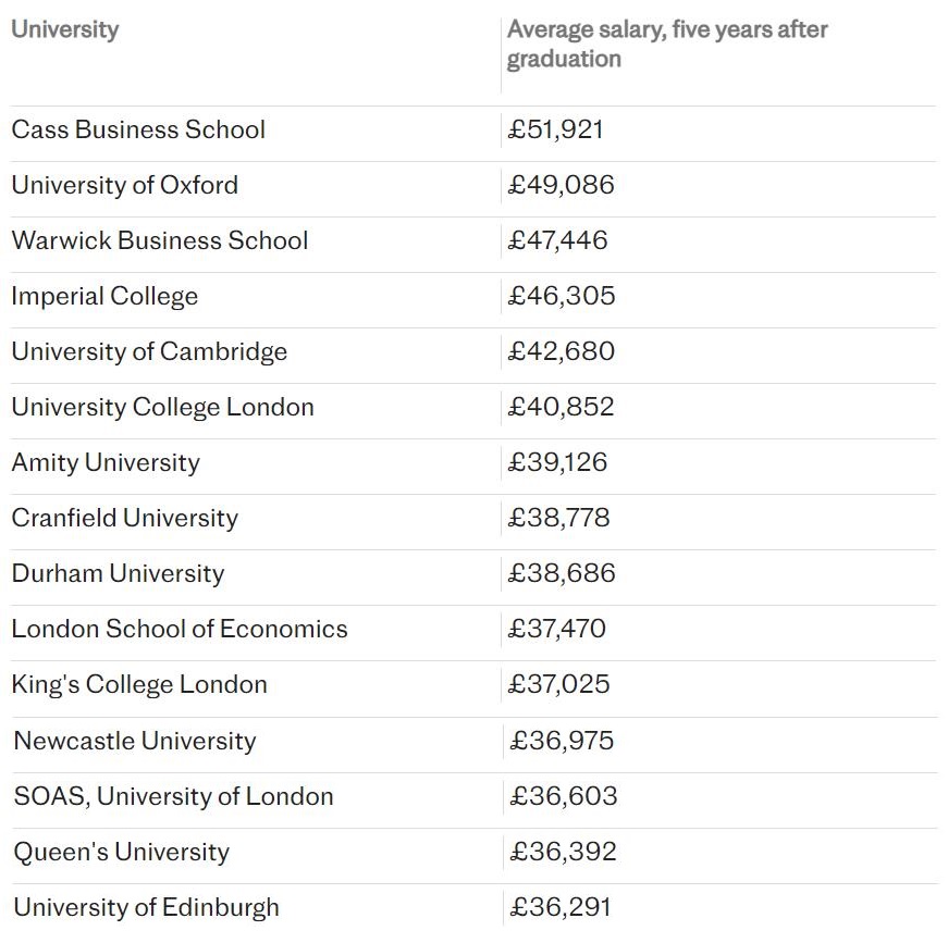 除了对不同学位的就业薪资进行研究外,Adzuna还研究了不同大学的毕业生在职业生涯五年后的预期收入。