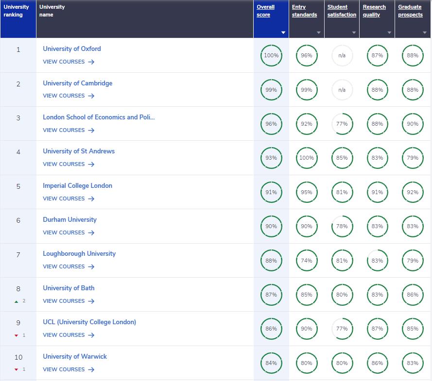 比如在2023年Complete University Guide的顶尖大学排行榜中,牛津和剑桥就分别获得了第一、第二的成绩。