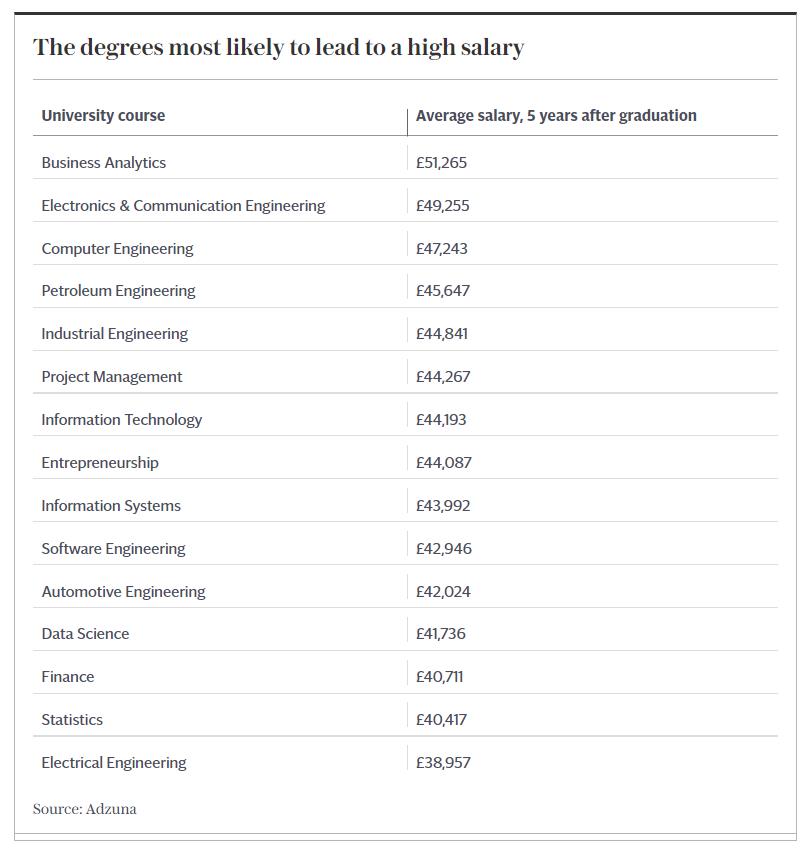 排名最高的课程是商业分析(Business Analytics),毕业生在离开大学五年后有望获得51,265英镑的平均收入。
