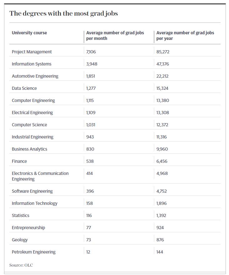 目前,每月大约有3,948个针对信息系统(Information Systems)专业的工作岗位可供选择,仅次于项目管理(Project Management)专业毕业生可选择的职位,对他们来说每个月有7,106个职位空缺。