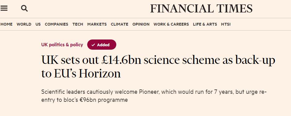 - 英国制定耗资146亿英镑的科学计划,作为欧盟“欧洲地平线”计划的替代…