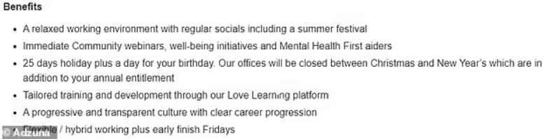 Adzuna表示,这项福利似乎是针对初级员工的,因为招聘广告中超过75%的岗位的薪水在20,000至40,000英镑之间。