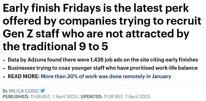 - 为吸引不喜欢传统朝九晚五工作的Z世代,数百家英国企业正试图在招聘时提供周五提前下班的福利…