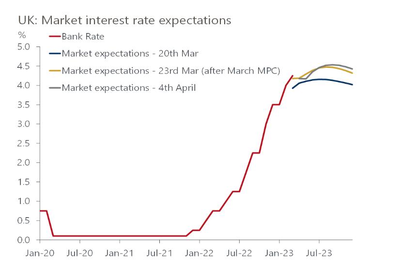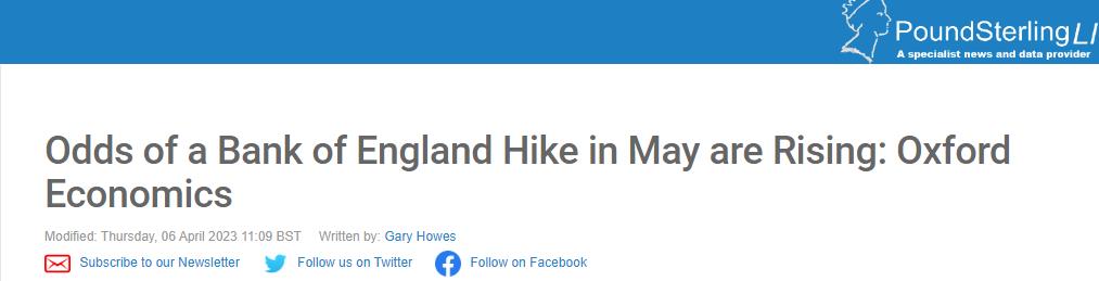 Oxford Economics的首席英国经济学家Andrew Goodwin表示:“本周的事件表明,英国央行在5月再次加息25个基点的可能性正在上升。”