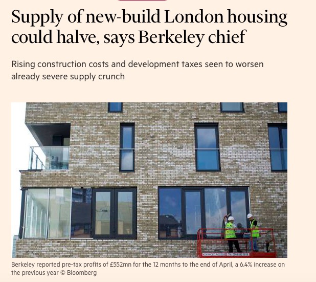 因建筑成本和开发税的上升,伦敦新建住房供应可能会减半,这将使本已严重的供应紧张进一步恶化。