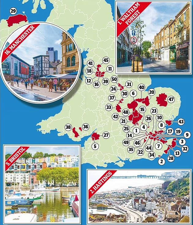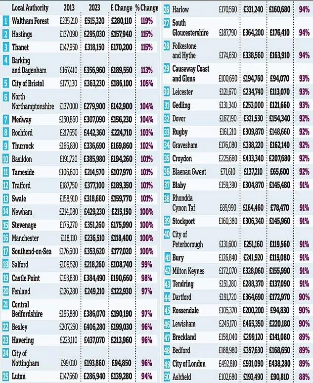 数据显示,10年前在这些地区之一买房通常要花费130,495英镑。如今,价格在10年内已经翻了一番,达到261,610 英镑。这意味着自2013年以来,这些地区房价平均每年上涨13,111英镑。