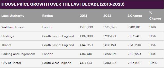这其中,位于伦敦的Waltham Forest成为“最大赢家”,房价在10年间增长了119%,涨幅位居全英首列。