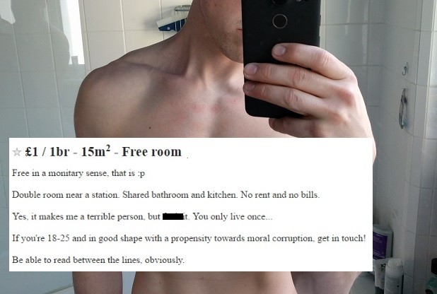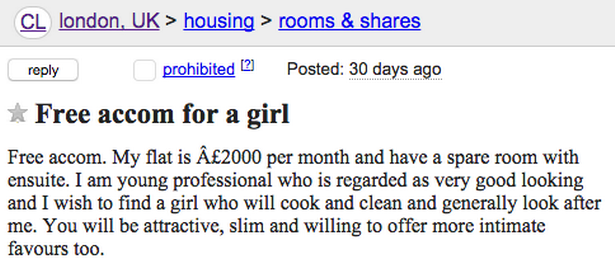 “免费出租:我的公寓2000英镑每个月,我是一个年轻的专业人才,还长得非常帅。现在需要找一个可以帮我洗衣做饭照顾我的女孩,最好是身材苗条的,可以提供那种服务的…”