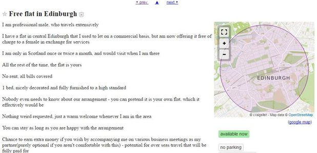 “爱丁堡免费公寓出租:我每个月只住在这个公寓一两次,现在寻求一个可以提供特殊服务的女租客…”