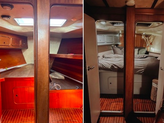 出发之前,他们把原本比较破旧的小船改造了一下。这是卧室,改造以后变得舒适温馨。
