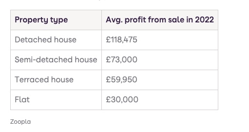 独栋别墅的卖家赚得最多,其次是半独栋房产的卖家,平均赚取73,000英镑,联排别墅的卖家赚取59,950英镑。