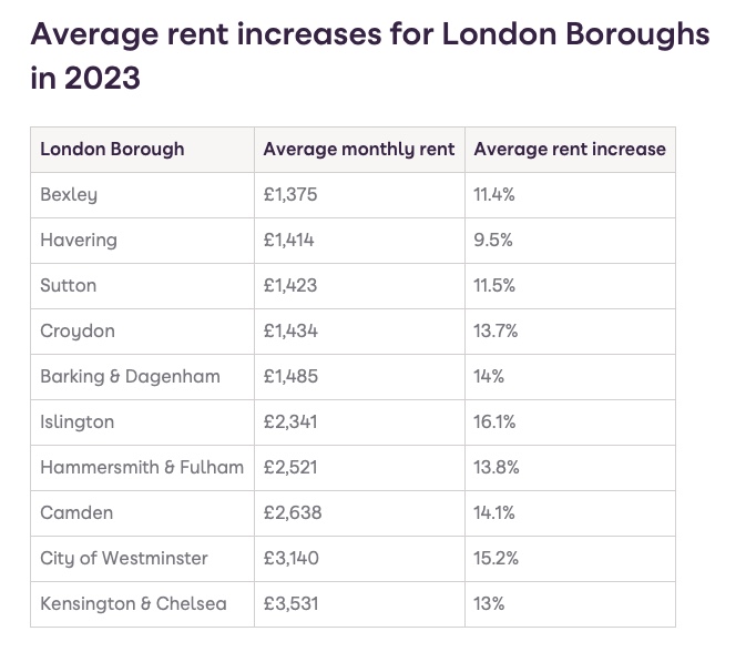 具体来看,伦敦Islington的租金涨幅最大,为16.1%,平均月租金£2,341。其次是Westminster,平均月租金£3,140,年涨幅15.2%。第三是Barking & Dagenham,平均月租金£1,485,年涨幅14%。