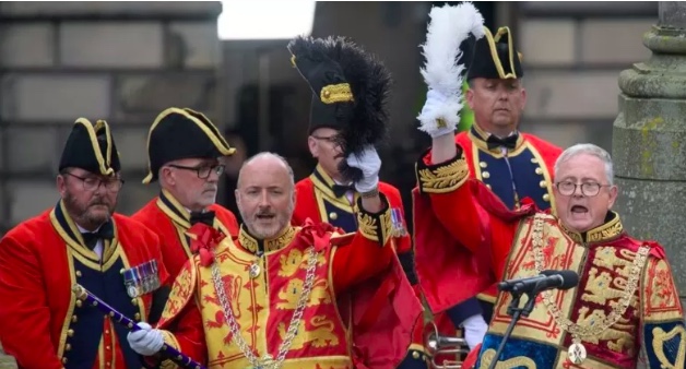 - 承认:君主站在拥有700年历史的加冕椅旁,坎特伯雷大主教将君主展示给聚集在教堂内的人,全体高呼“天佑国王!”,奏响号角