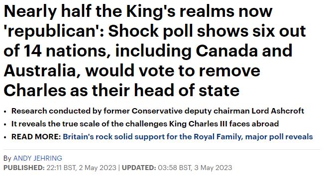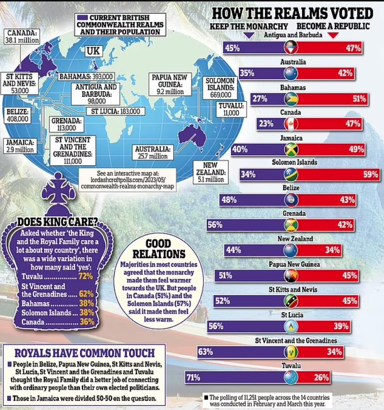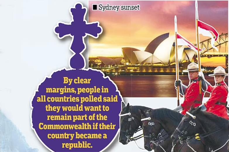 在接受调查的人中,42%的澳大利亚人支持共和制,35%的人反对,而47%的加拿大人希望改变,只有23%的人支持君主制。