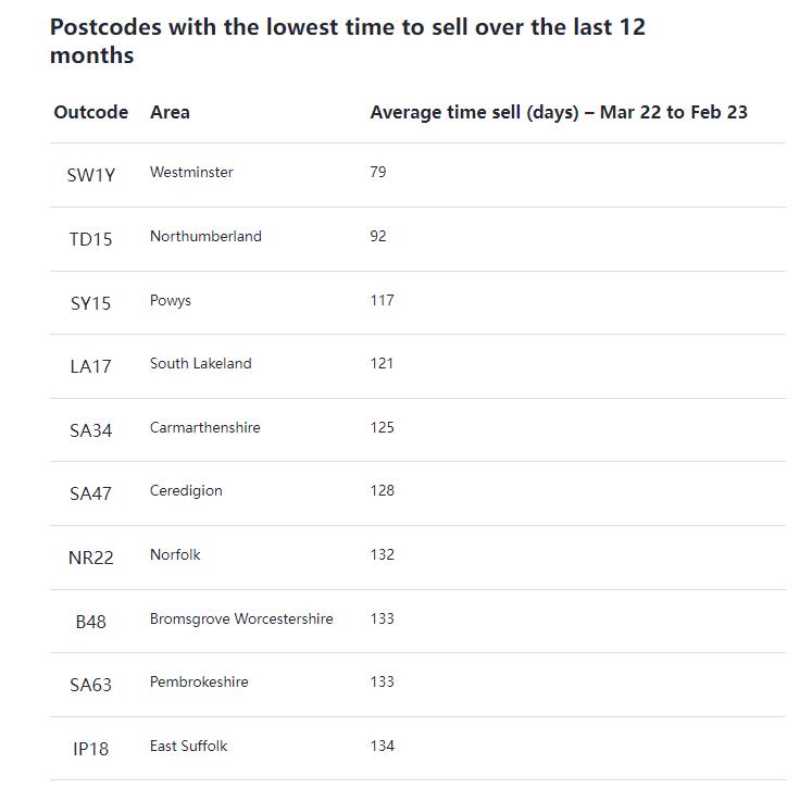 而位于Powys的SY15邮编区 (117天)、South Lakeland的LA17邮编区(121天) 和Carmarthenshire的SA34邮编区(125天) 也位列销售速度最快的市场的前五名。