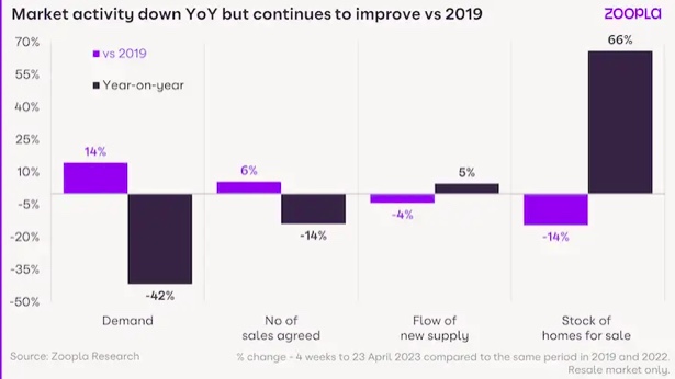 - Zoopla数据显示:随着新销售数量的增加,需求继续复苏。复活节假期后,买家的需求达到了今年的最高水平,比2019年高出14%。