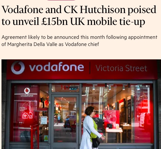 据金融时报报道,沃达丰(Vodafone)和长江和记实业(CK Hutchison)即将就两家英国电信业务150亿英镑的合并达成协议,这将缔造英国最大的移动运营商,拥有2,800万客户。