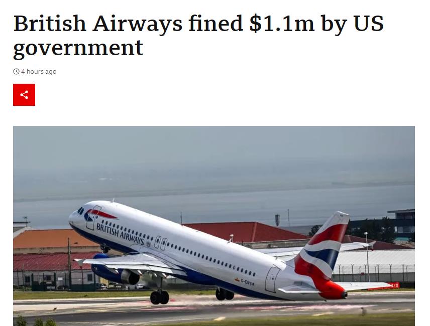 - 英国航空公司被美国政府罚款110万美元,原因是该公司未能在疫情期间为取消的航班支付退款…