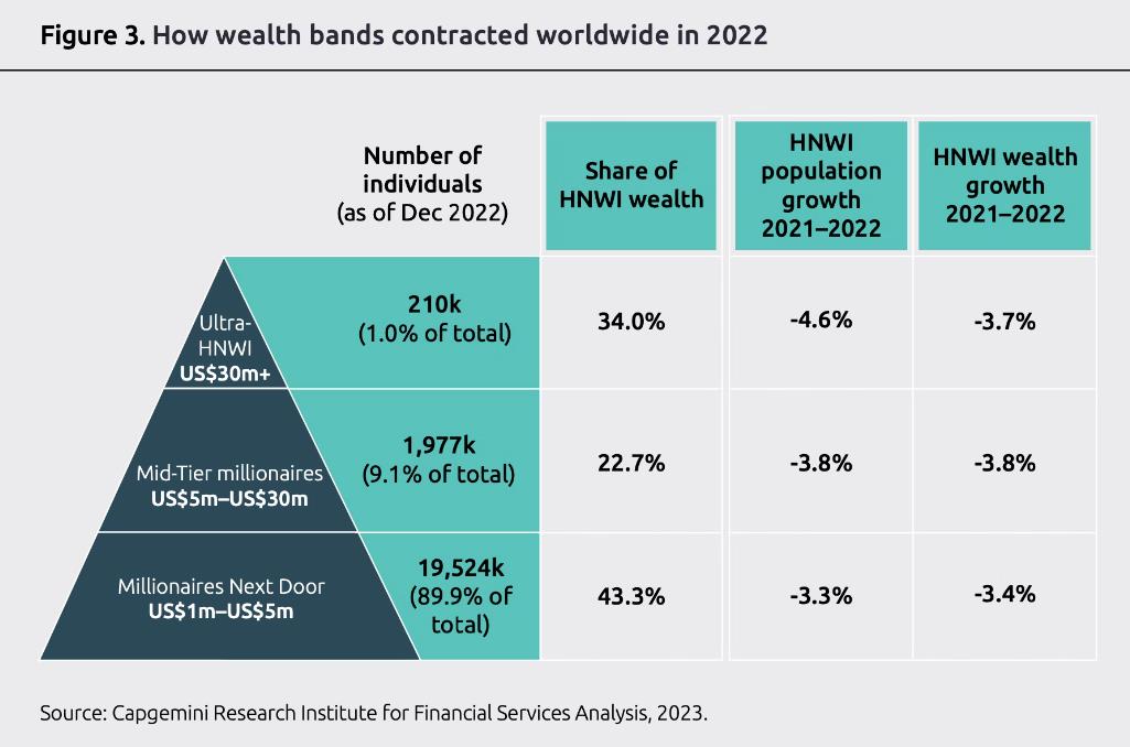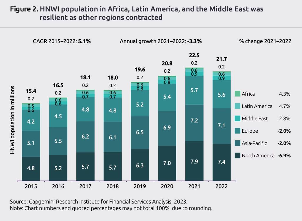 相比于2021年,2022年全球高净值人士 (HNWI) 的人数下降了3.3%,总人数为2,170万。