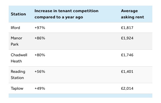 当数伦敦东部的伊尔福德(Ilford),租房者之间的竞争在一年内几乎翻了一番(+97%)。同样位于伦敦东部的Manor Park和Chadwell Heath车站附近的地区也出现了大幅增长。