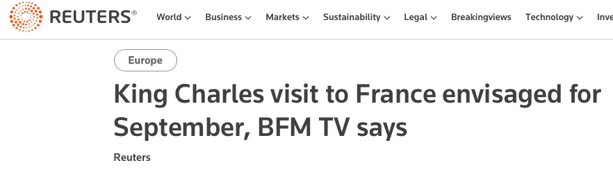 - 据路透社报道,英国国王查尔斯三世拟于9月访问法国。