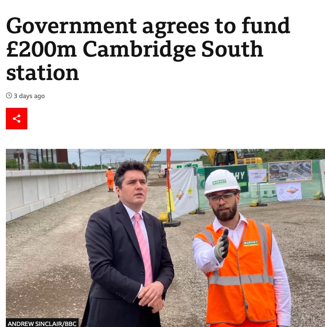 - 英国政府拨款2亿英镑在南剑桥建设新火车站。