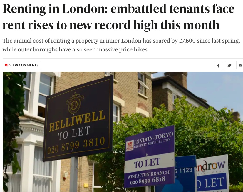 今年4月,伦敦的平均租金达到创纪录的每月2,210英镑,房价进一步上涨打击了租户。4月单月上涨1.5%,相当于全年上涨17.2%。