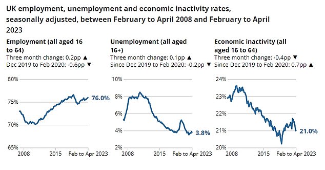 这些数字令人大吃一惊,因为经济学家和英国央行一直预计,在连续12次加息的压力下,劳动力市场将会放松。相反,工人短缺现在正在推动工资-物价螺旋式上升,因为许多人在疫情期间退出了劳动力市场。